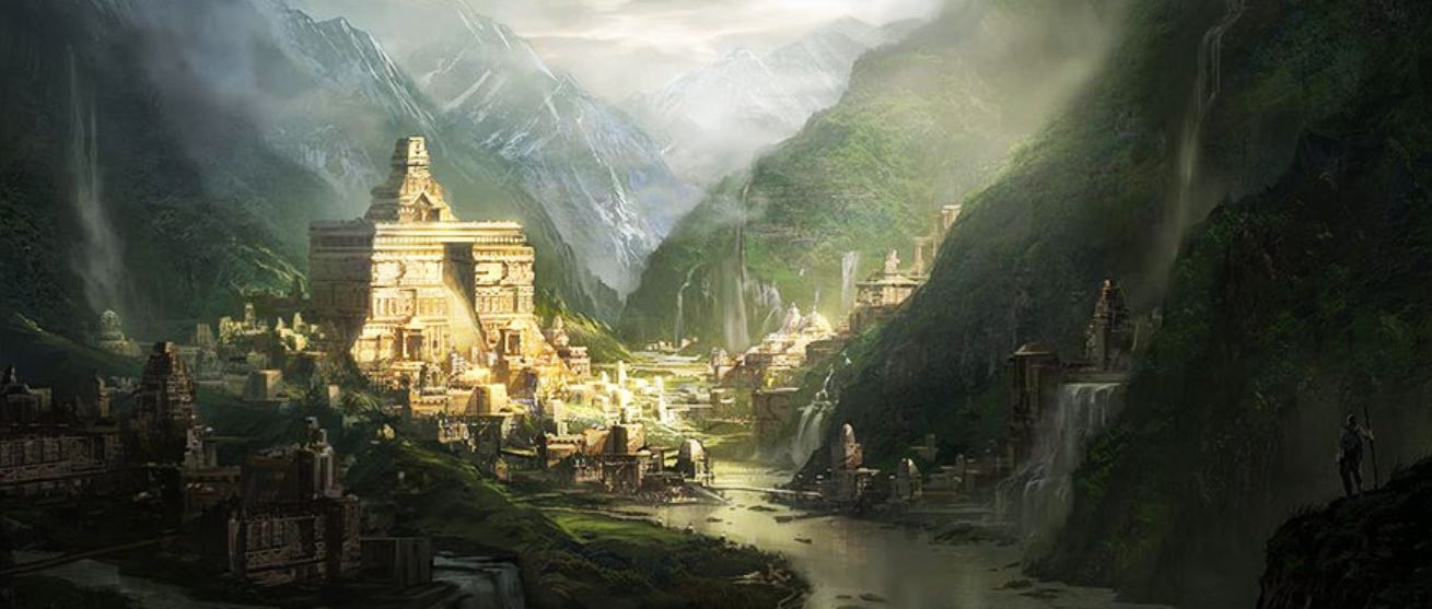 “But the power and teachings of the sages will ward off these threats to your life and permit you to follow the path that leads to the north, toward Shambhala. After many harrowing days of travel, you will come out in a beautiful land of gold and jewels–the country of fabulous beings who are neither men nor gods … The fabulous maidens who dwell there, always happy and singing songs, have lovely moon faces, beautiful as lotus blossoms, with eyes like blue flowers. Sashes of fine cloth decorated with pearls adorn their golden bodies.”
